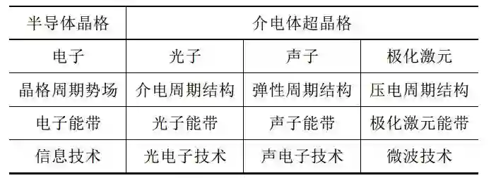 表1列举出半导体晶格和介电体超晶格所具有的不同粒子(如电子和光子)、准粒子(如声子和极化激元)能带, 周期结构的类型以及可能的应用领域. 我们期待介电体超晶格能像半导体超晶格一样,通过不同能带的设计、裁剪, 实现粒子、准粒子的调控,对光电子技术、声电子技术以及微波技术作出贡献.