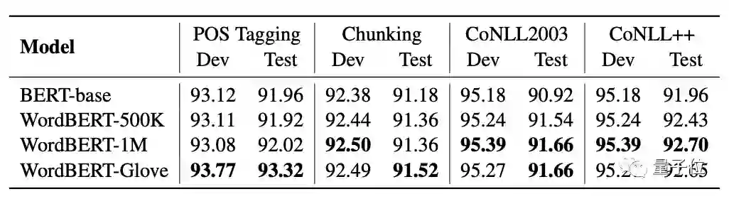 在词性标注、组块分析和命名实体识别(NER)等分类任务中,WordBERT的成绩如下: