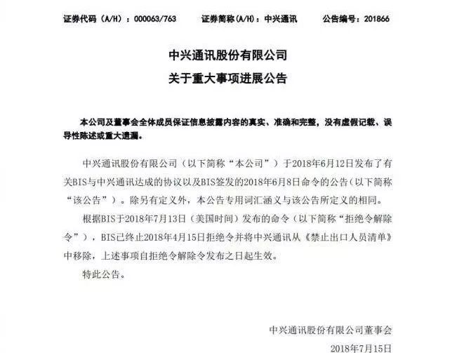中兴通讯昨日发布公告称,BIS已终止2018年4月15日拒绝令并将中兴通讯从《禁止出口人员清单》中移除,上述事项自拒绝令解除令发布之日起生效。