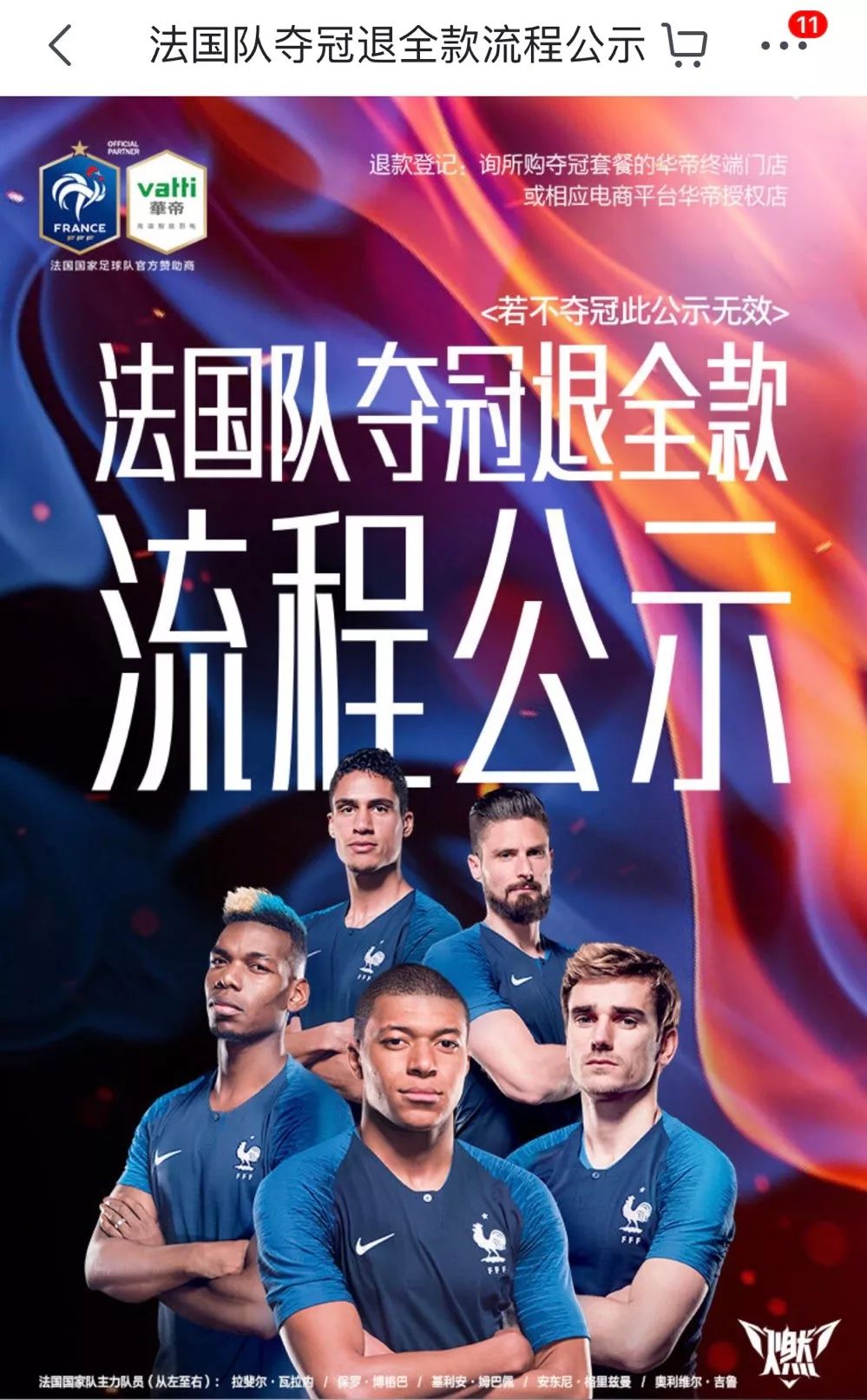 法国队夺冠,华帝公司发布公告称,庆祝法国队夺冠,华帝退全款启动。
