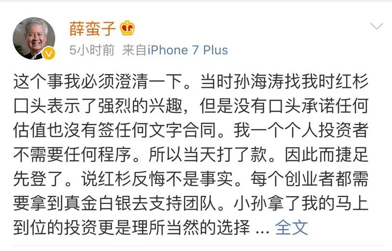 36氪讯,薛蛮子针对《薛蛮子实名曝料:红杉答应投资又反悔 51信用卡曾差点发不出工资》新闻回应称,说红杉资本反悔投资51信用卡并不属实,当时孙海涛找薛蛮子时红杉囗头表示了强烈的兴趣,但没有口头承诺任何估值也沒有签任何文字合同。薛蛮子作为个人投资者不需要任何程序,所以当天打了款。