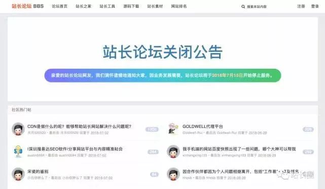 日前,站长论坛发布了一则关闭的公告。站长论坛发布公告称,因业务发展需要,论坛将于2018年7月15日正式停止运营。