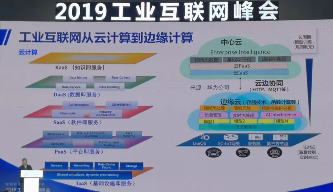 华为的工业互联网平台2018年发布,名为FusionPlant,是工业互联网的底座。华为轮值董事长在2018年10月华为大会上发布了全场景的AI技术,包括昇腾芯片,这些芯片应用在了云里面做推理和训练;也有用在边缘计算中,用在智能设备中的,让机器设备这一层能够很容易地具备新的AI能力,这样边缘和中心云中间的AI就可以协同起来。