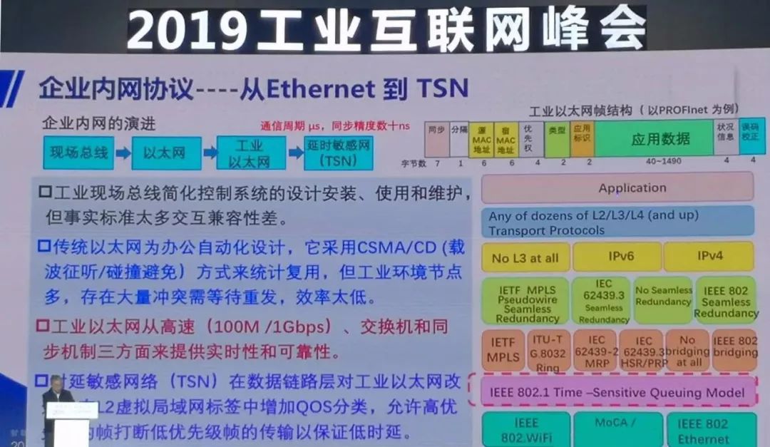 企业的内网,经历了现场总线、工业以太网和延时敏感网TSN。TSN在以太网上叠加优先权的控制,通过牺牲一般业务的服务质量,来保证高要求业务的质量,所以企业内网也会发生一些变化,从以太网到TSN。