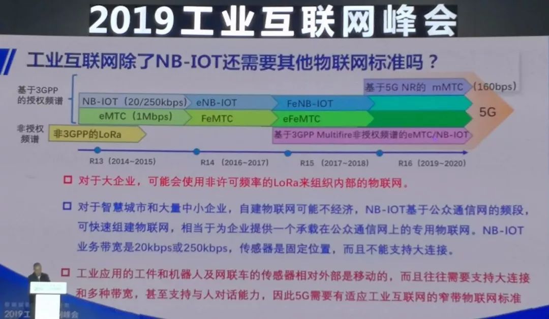 对于大企业可能会用Lora来组织内部的物联网。对于智慧城市和大量中小企业,自建物联网并不经济。基于运营商公网的NB-IoT,带宽并不高,20Kbps或250Kbps,对应的传感器是固定的,不能支撑大连接。工业机器人,传感器是移动的,而且需要大连接和多种带宽,甚至需要跟人对话,所以5G需要开发一些适应工业互联网的窄带物联网标准。