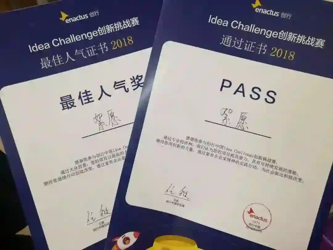 2. 作为絮愿项目组发起人&项目经理:创行孵化赛一等奖、2018创行秋培PASS卡、最佳人气奖。