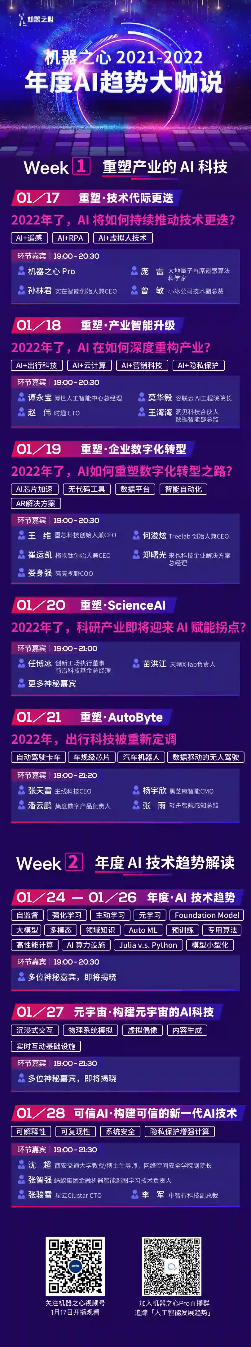 2021 年 2 月 1 日至 9 日期间,机器之心发起首届「年度 AI 趋势大咖说」暨「机器之心 Pro · 人工智能 2020 年度回顾与 2021 趋势前瞻」特别策划,携手二十七位耳熟能详的 AI 重磅专家通过线上直播的方式进行了为期 5 天的精彩分享,通过主题分享及多人圆桌等形式,解读涵盖 AI 科研、AI 产业融合及智能制造、智慧城市、数字新基建等十多个年度热点性领域的智能化发展趋势累计超过 20 万的直播关注,并同期联合百度科技发布视频节目《AI Talks》,携超过五十万观众畅游人工智能产业的过去、现在和未来,探讨 AI 带给社会的变革与机遇。 作为「与 AI 俱进,化时光为翎」机器之心 2021-2022 跨年特别策划中的重要组成部分,「机器之心 2021-2022 年度 AI 趋势大咖说」聚焦「驱动未来的 AI 技术」与「重塑产业的 AI 科技」,推出线上分享,邀请行业精英、读者、观众共同,回顾 2021 年中的重要技术和学术热点,盘点 AI 产业的年度研究方向以及重大科技突破,展望 2022 年度 AI 技术发展方向、AI 技术与产业科技融合趋势。 1000 分钟精彩不停歇,透视 AI 技术,畅聊 AI 融合的新一代产业科技 本次线上分享会为期两周,分为两个主题周,第一周主题为「重塑产业的 AI 科技」,将于 2022 年 1 月 17 日——2022 年 1 月 21 日期间分为五期进行,来自博世中国、小冰公司、大地量子、实在智能、天壤智能、来也科技、亮亮视野等近 20 家企业的大咖嘉宾将分别做客「机器之心 2021-2022 年度 AI 趋势大咖说」直播间,围绕「技术升级」、「产业革新」两大方向,「企业 IT」、「AI for Science」、「智能驾驶与出行」等三大人工智能重点应用产业的发展趋势,尽可能的呈现 AI 未来的发展脉络。