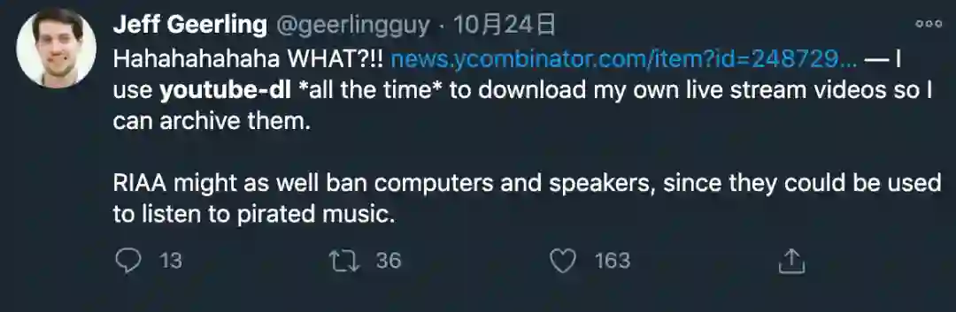 既是开发者又是油管博主,同时使用 youtube-dl 存储自己视频的 Jeff Geerling 对这件事感到愤慨: