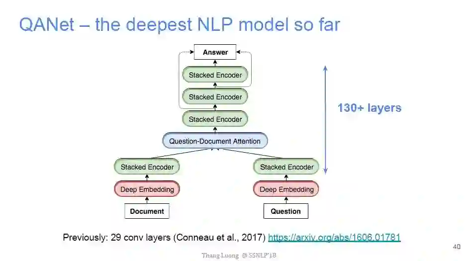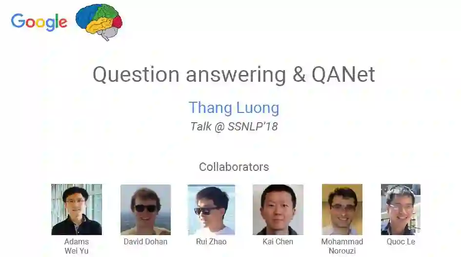 直到近期,谷歌大脑团队和CMU联合推出QANet拔得头筹,将EM值提高到了84.454,F1值也提高到了90.490。并且,难得的是,与其他团队动辄10几个小时的训练时间相比,QANet仅仅需要45分钟的训练时间。
