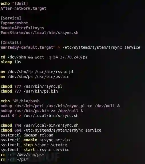 这个satan脚本首先会创建一个名为srsync的系统服务文件,然后自动运行。srsync服务会调用脚本/usr/local/bin/srsync.sh,而srsync.sh脚本会运行rsync.pl在这个perl脚本以及ps.bin代码文件。rsync.pl脚本来自于/dev/shm/rp,会跟.satan脚本一起从服务器传送过来,并使用wget命令获取ps.bin代码文件(来自于主机54.37.70[.]249)。需要注意的是,在恶意挖矿软件中,攻击者使用了crul作为wget的备用命令,