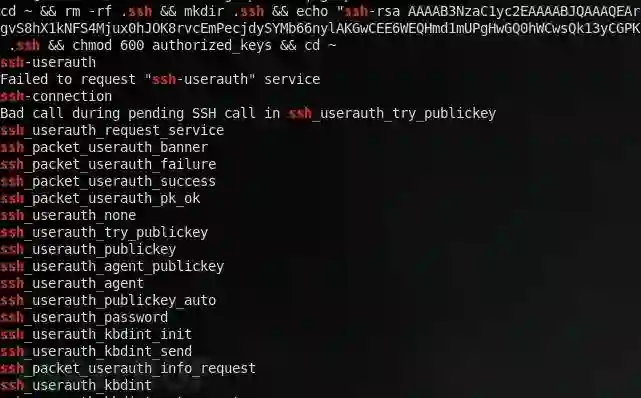 完成认证之后,攻击者立刻通过SSH执行了系统命令,而且所有命令都是通过实际的SSH命令传递进来的,因为我的系统是一个安装了自定义OpenSSH版本的蜜罐,所以我们可以查看到攻击者执行的命令: