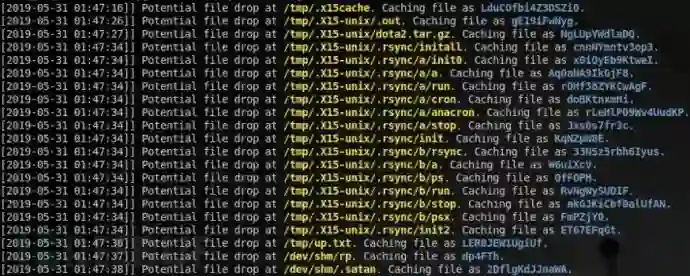 由此看来,.x15cache文件应该只是一个负责设置环境的Dropper,它还会获取主机54.37.70[.]249中的其他文件。第二个文件名叫dota2.tar.gz,这个tar文件包含的是一段恶意代码,目录名为.rsync。我用我的文件检测脚本提取了该文件中的部分内容: