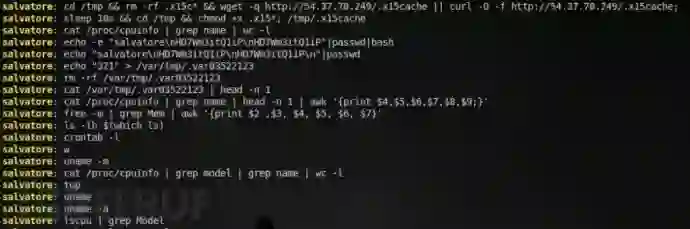 首先,攻击者通过HTTP向主机54.37.70[.]249请求了一个名为.x15cache的文件,然后在等待了10秒钟之后执行了该文件。除此之外,攻击者还将用户密码修改为了一个随机字符串。.x15cache文件的内容如下: