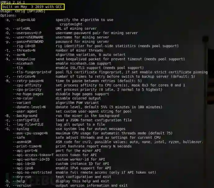 上图为xmrig命令的帮助页面,而它是一款针对门罗币的CPU挖矿软件。除此之外,我们还捕捉到了编译时间信息:2019年5月3日,也就是上个月。