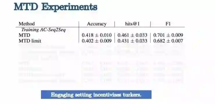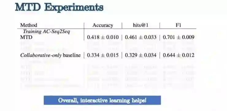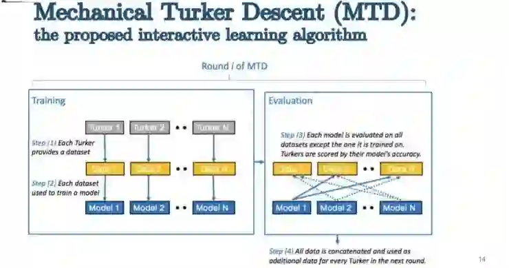 这个交互学习算法的名字叫Mechanical Turker Descent。第一步,每一个Turker会给dragon一些训练数据,第二步,用数据集训练出一个模型。第三步,这些模型会放在其他数据集上交互验证,每个模型会得到分数,获得高分的Turker会获得奖励。第四步,所有的数据将合并起来,进入下一轮,直到训练出比较好的agent。