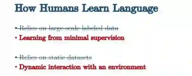 反观人类是如何学习语言的?人类只需要非常少的监督信号,通过动态与环境交互,在环境中执行一些行为,得到一些反馈,进行学习语言。