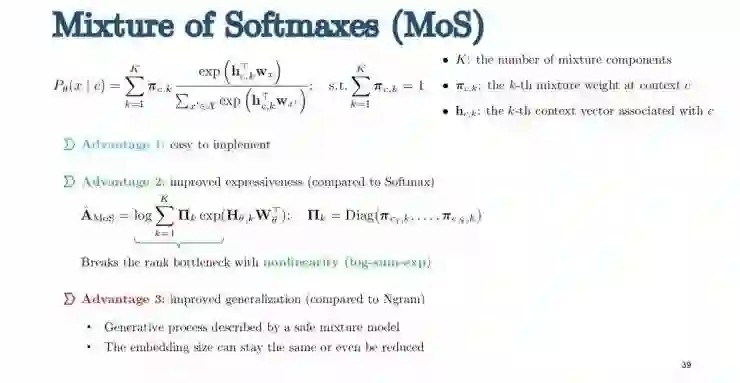 我们首先证明了softmax不是太好,继而提出了混合softmax,(mixture of softmaxes)的方法,先算K softmaxes,用weighted sum得到最后的概率。