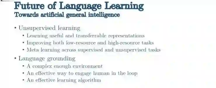 无监督学习可以学习有价值的和可传递的特征表示,可以改善低资源和高资源任务;可以用于监督或无监督任务的元学习。language grounding可以提供足够复杂的环境,是一种非常有效的学习算法。