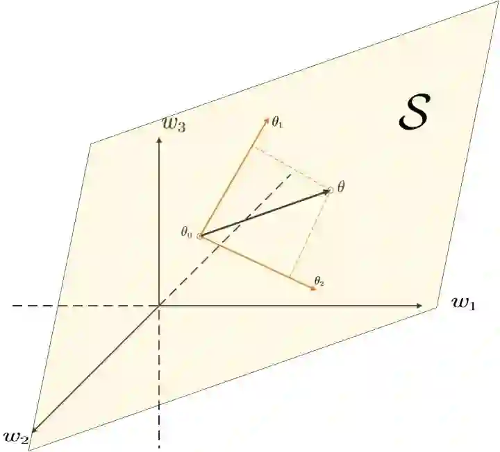 其实是一个线性空间,因为无论是数乘还是加法在这个空间都是封闭的,同时,我认为这个空间不是内积空间,因为在参数空间定义内积似乎没有意义,不确定是否是赋范空间,希望有了解的朋友指出。不管怎么说,因为这个参数空间是一个线性空间,我们可以用空间的非线性相关基底表示空间中的任意一个点了。特别的,我们考虑这个空间中的一个平面