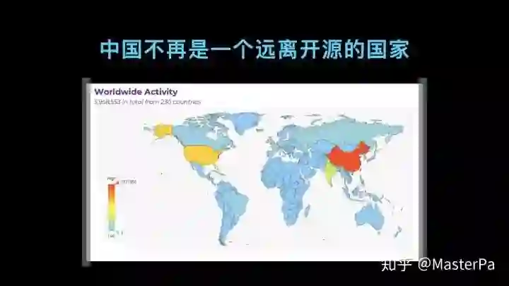 这张图是从阿帕奇基金会截得,阿帕奇基金会是全球最大的开源运行组织。他们从 2018 年到 2019 年最大的访问量来源其实是中国,而不是美国。我们仔细看可以发现,中国的访问人数是美国的一倍,中国并不是一个远离开源的国家。