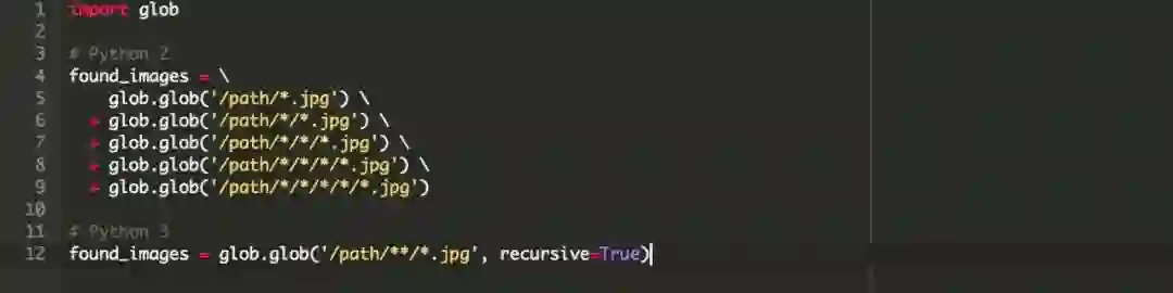 在 Python2 中递归文件夹通配并不容易,即使 glob2 的自定义模块已经解决了这个问题.自 Python 3.5以来便支持了递归标识: