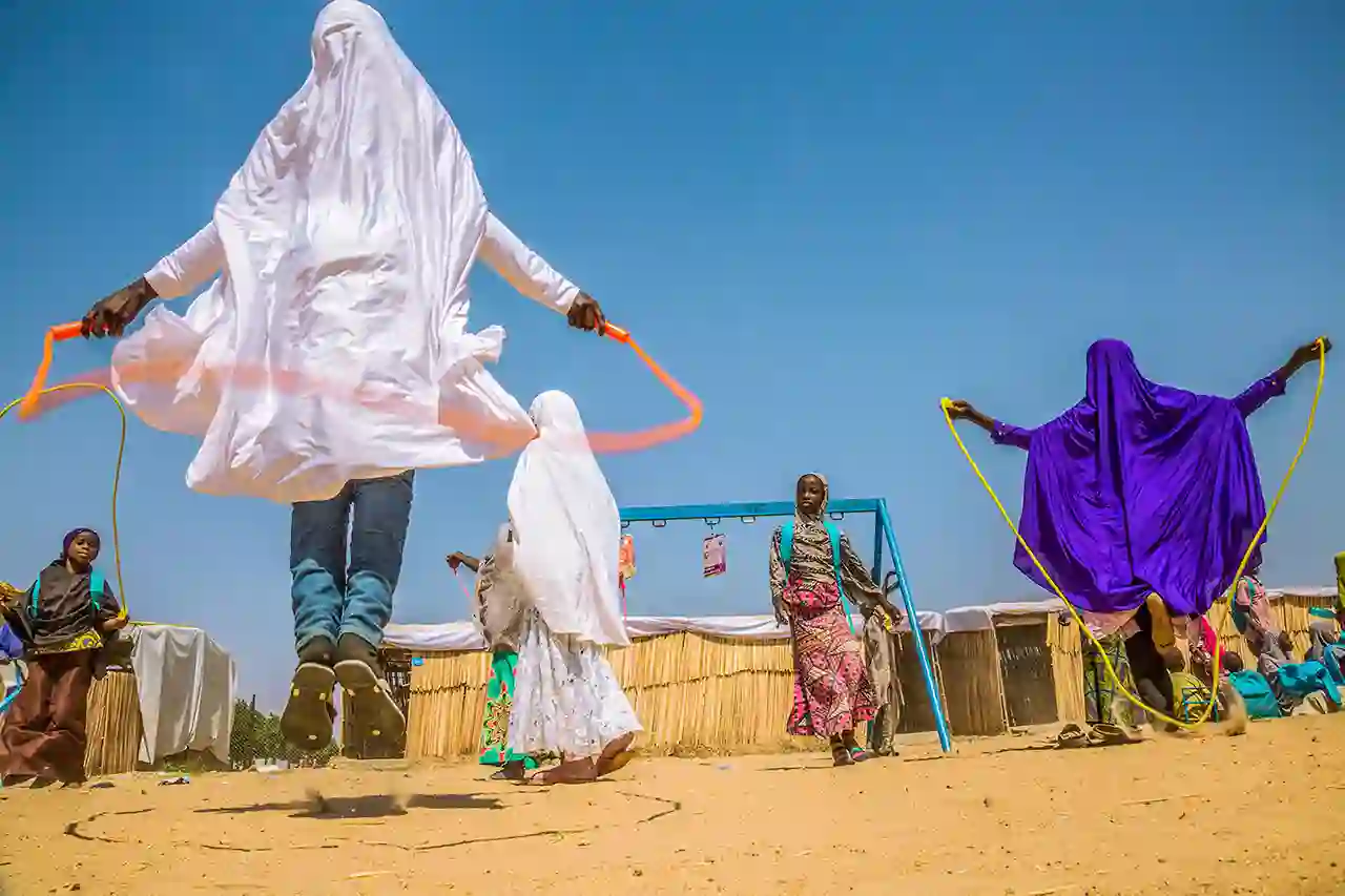 图片描述:在尼日利亚博尔诺州的Muna Garage营地,孩子们在一个安全的地方玩耍