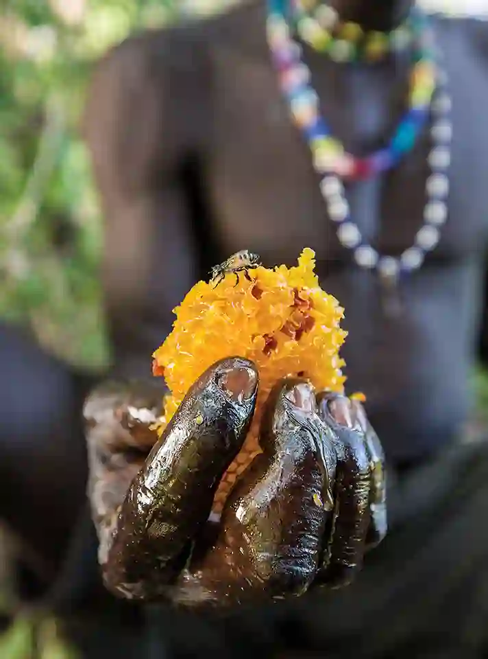 图片描述:在坦桑尼亚,一名哈扎人采集者(gatherer)拿出一片蜂巢