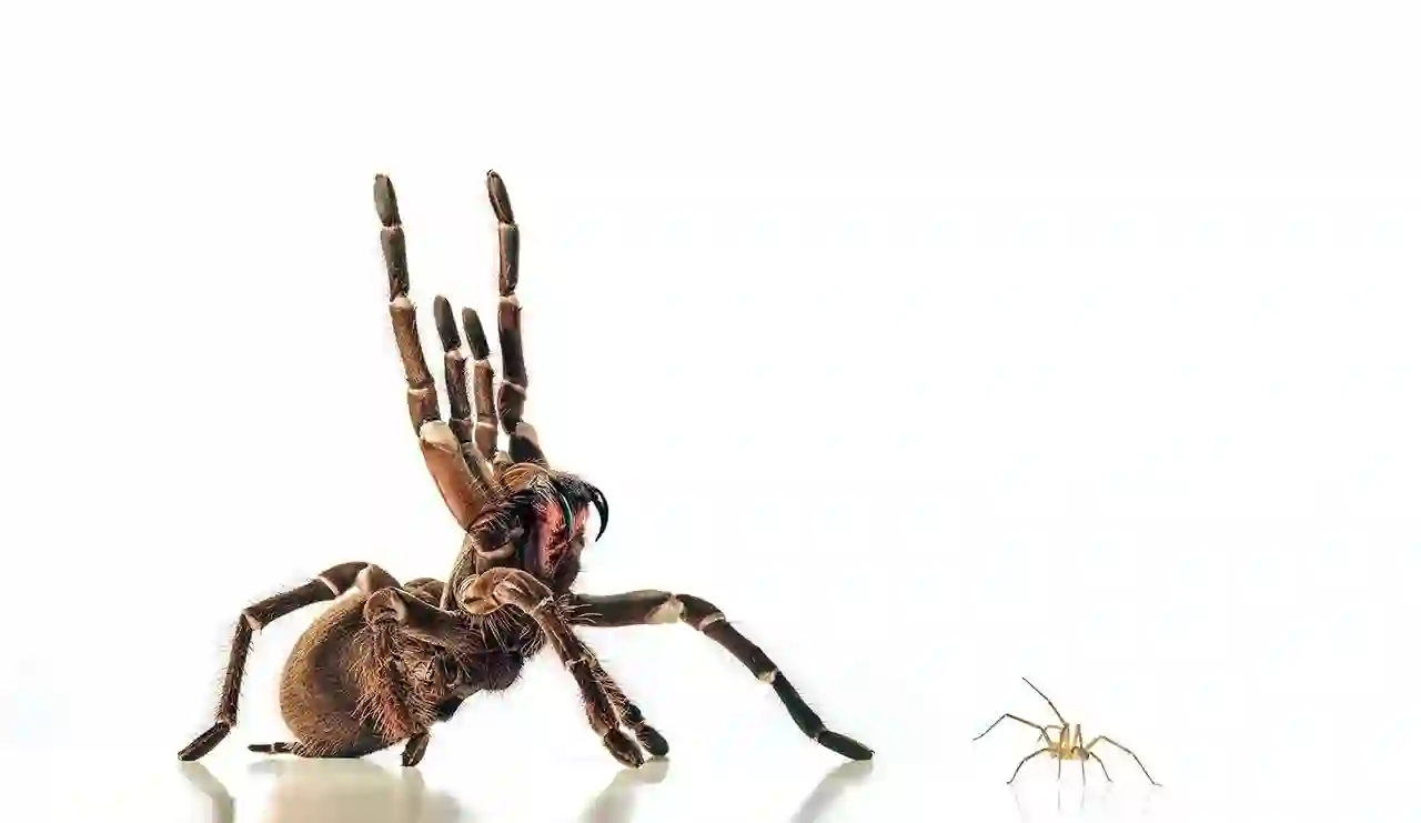 图片描述:一只哥利亚食鸟蛛(Goliath bird-eating spider,左)和一只褐色隐士蜘蛛(右)