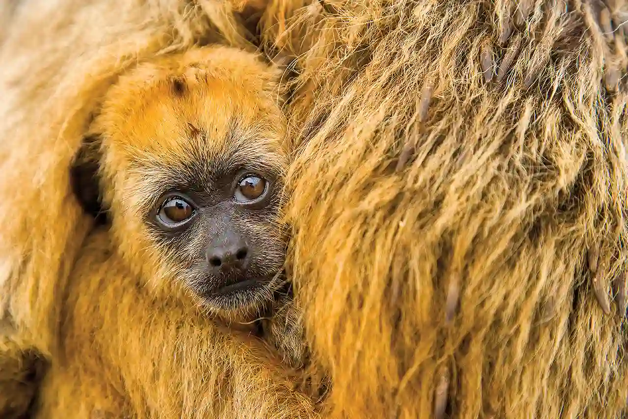 图片描述:一只黑金(black-and-gold)小吼猴(howler monkey)被它的妈妈紧紧抱着