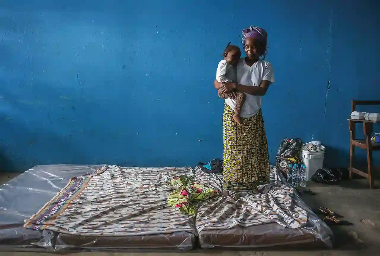 图片描述:在蒙罗维亚,一位母亲抱着她的孩子站在他们的床垫上