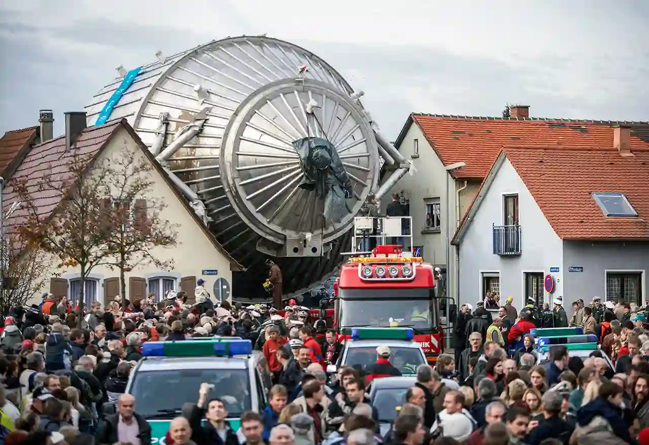 图片描述:被设计用于测量宇宙中难以捉摸的中微子质量的一个巨型装置在经历了2个月的奇幻海上之旅后,到达了一个小城镇。看看照片,真是太挤了!