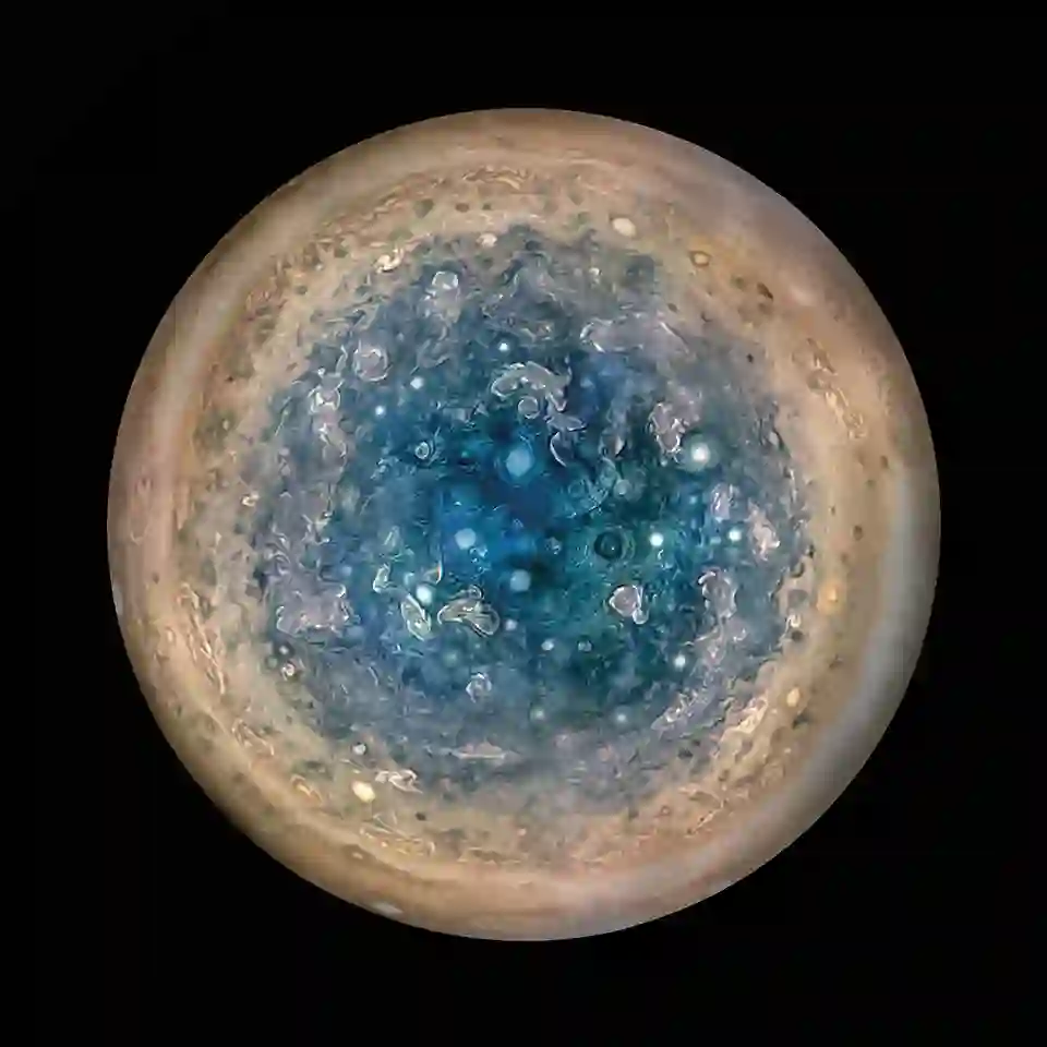 根据2017年5月26日Science发表的论文,朱诺号于2011年8月5日发射,2016年7月4日进入环绕木星的轨道。木星南极的这幅影像,由朱诺号在52000千米高空拍摄。这是由朱诺号上的JunoCam在3次不同飞越过程中拍摄的照片合成的。