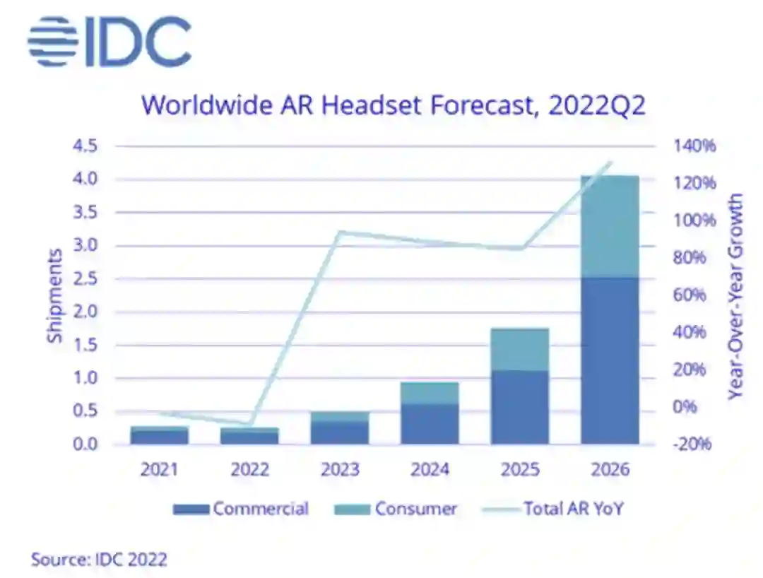 展望未来,尽管2022年的出货量统计有所下降,但这家机构相信所述领域依然将能出现大幅增长。预计到2026年底,AR头显市场的五年复合年增长率(CAGR)将达到70.3%,达到410万台。