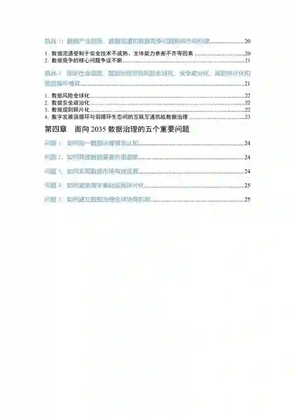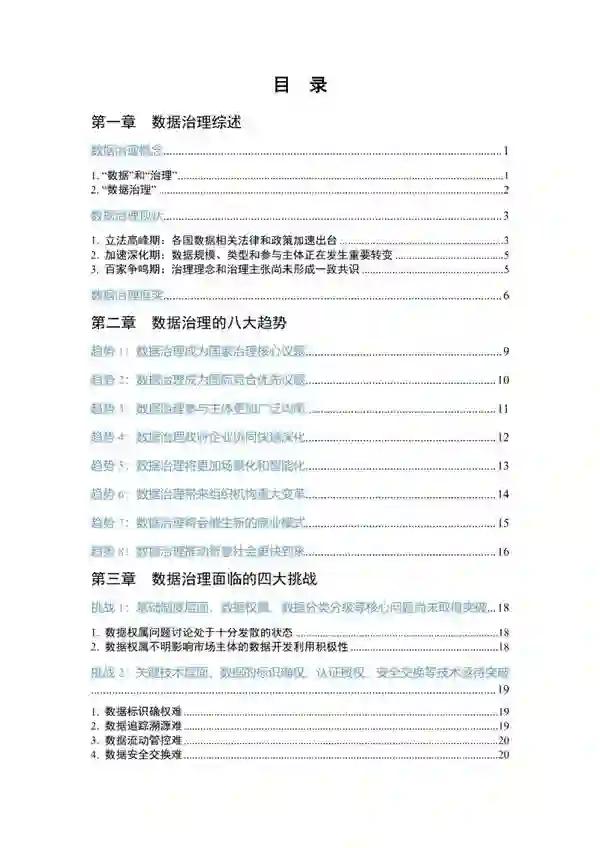 当前,国内外在数据治理的理论、技术、规则和应用等方面准备不足,实践中遇到越来越多的问题。本报告将站在中长期发展的视角,总结当前及未来一段时间内数据治理发展的八大趋势,以及在基础制度、关键技术、市场产业和国际社会等层面面临的四大挑战,并提出当前亟待研究解决的五个重要问题,以期为各方研究和讨论完善数据治理体系以及相关重大议题提供有益支撑。