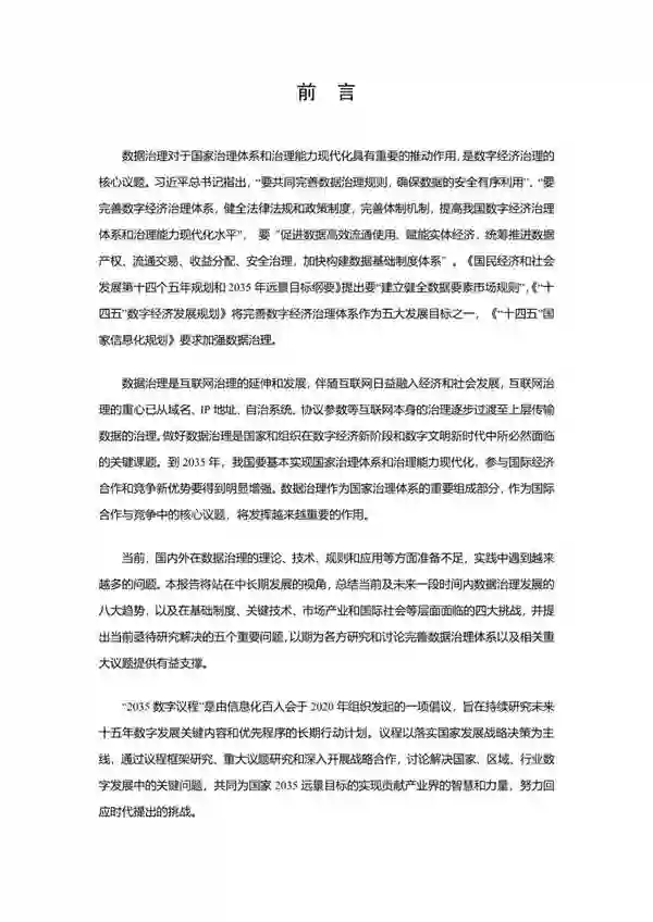 做好数据治理是国家和组织在数字经济新阶段和数字文明新时代中所必然面临的关键课题。到2035年,我国要基本实现国家治理体系和治理能力现代化,参与国际经济合作和竞争新优势要得到明显增强。数据治理作为国家治理体系的重要组成部分,作为国际合作与竞争中的核心议题,将发挥越来越重要的作用。