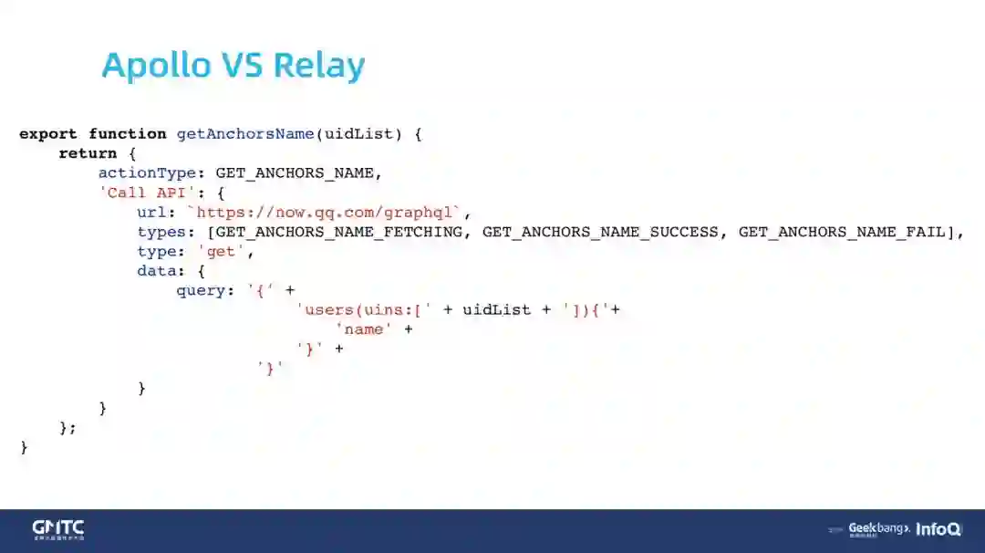 这是 Relay 的 GraphQL 形式,它实际是 Query 是通过一个 React Apollo 这样的组件发起的,然后直接把后端请求的数据以 props 的形式传递到真正的业务组件里面去。