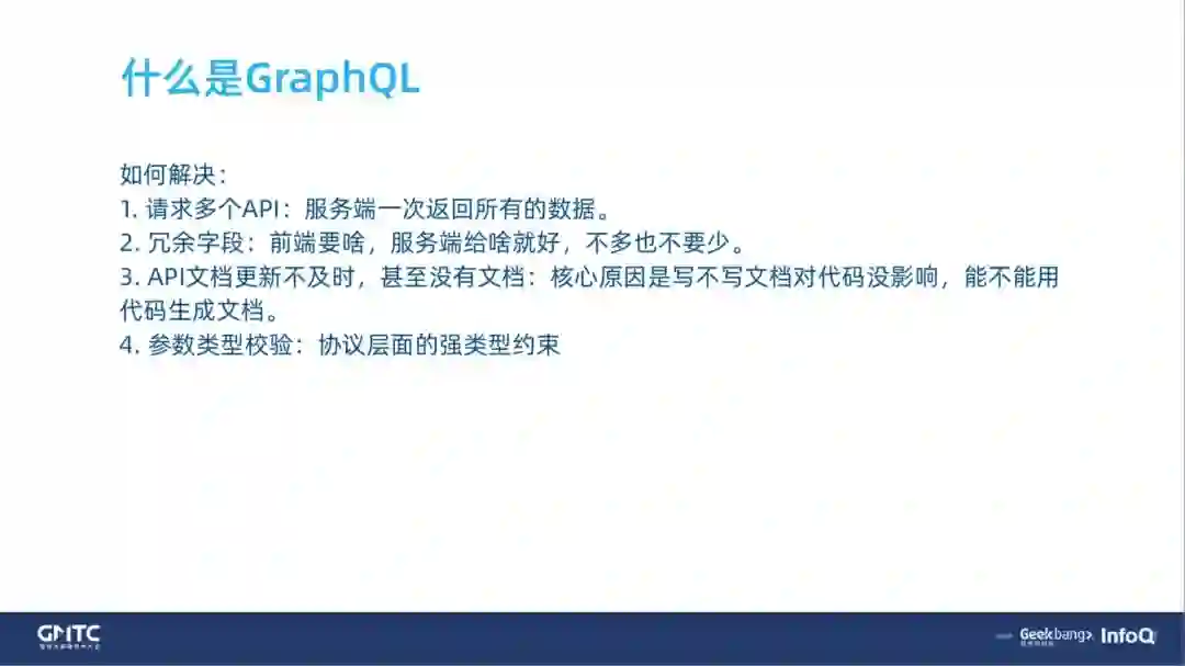 针对 API 文档更新不及时,GraphQL 的解决方案是,在写好后端代码后,不需要写接口文档,因为已经和前端的同学定义好字段的类型。写过 TypeScript 的同学应该知道,每个字段对应的是一个强类型的字段校验规则。其次,利用 GraphQL 的自检性,你就可以完全的看到这个接口可以提供哪些字段,每个字段代表的含义是什么,每个字段返回的参数的类型是什么,以及它可以接收怎样的参数。