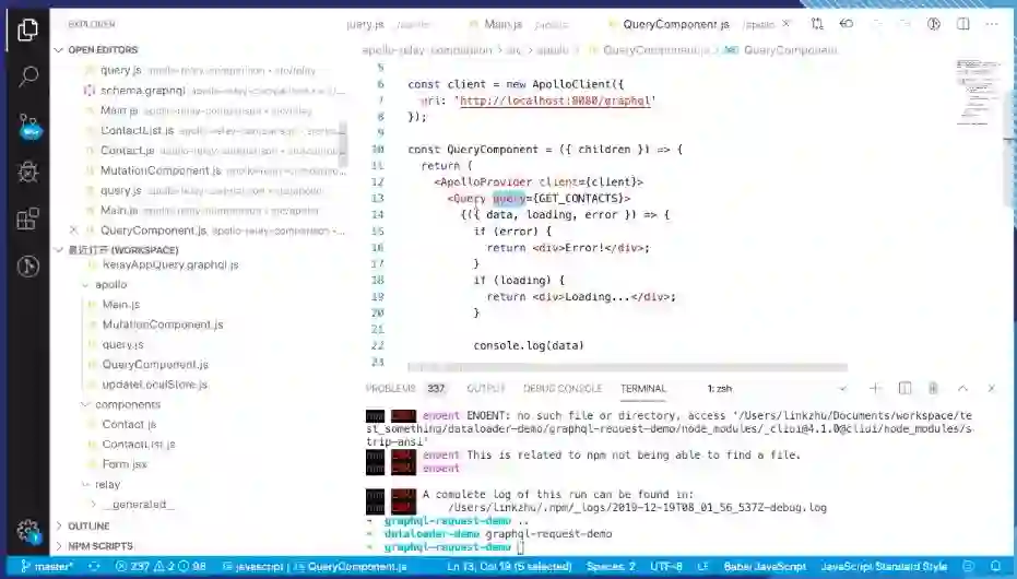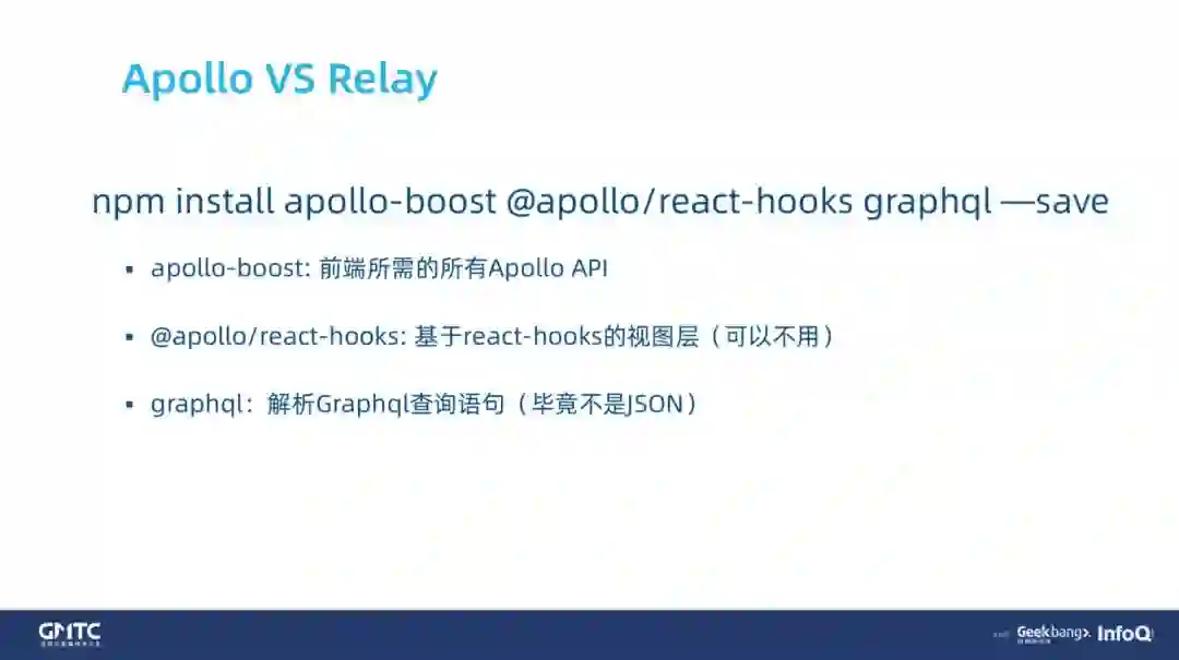 这三个包怎么用呢?apollo-boost 这个包,提供了所有前端需要的 API,包括转换,构造 GraphQL Query 的请求参数,以及设置 GraphQL 后台接口等。apollo/react-hooks 是基于 react-hooks 的视图层,如果现有业务代码里面没有用到 react-hooks ,可以先不用管它。graphql 是 Facebook 官方提供的一个包,用来解析官方查询语言,因为它毕竟不是一个 JSON,当发起请求时 ,它会做一些处理。
