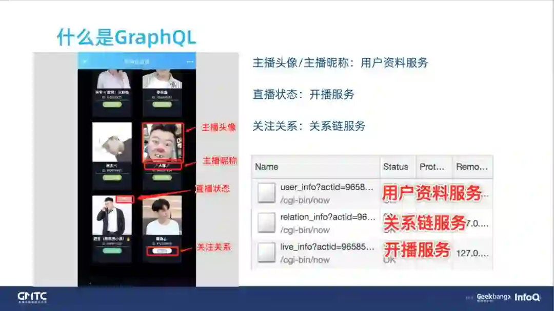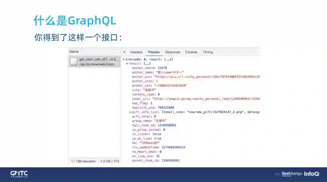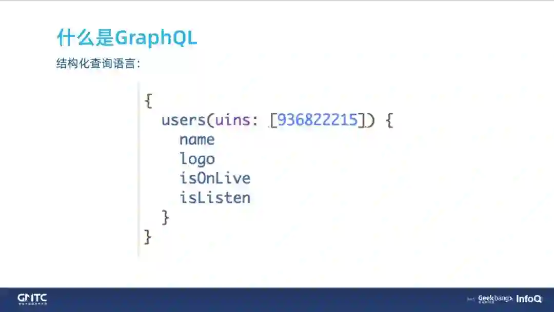 上图就是在前端发起一个 GraphQL 查询的样子,它其实不是 JSON,但是非常像 JSON 包裹起来的。看上图,users 就是 list,它想请求一个用户的列表,那么传入的参数是一个数组,但我这里只传了一个数组元素,这里 unis 即用户唯一标识符。返回的数据就包裹在下面这个花括号里,包括姓名、头像 logo、是否在线、是否在开播,以及用户是不是关注了他(isListen)。