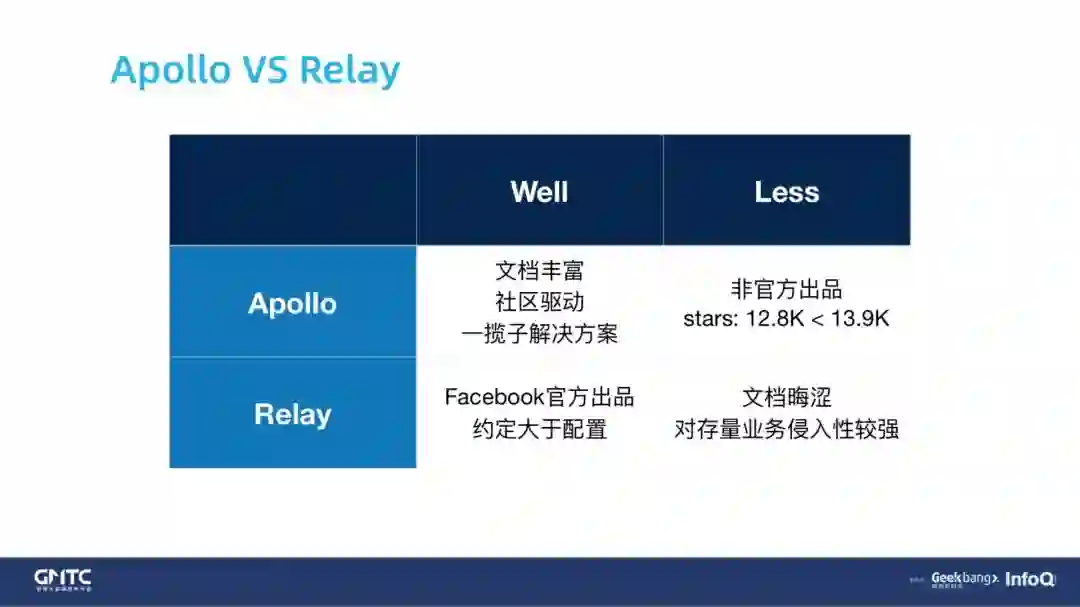 其次,GraphQL 在前端的选型,即 GraphQL Client 端的选型,目前业界最火的有两个方案,一个是 Apollo,另一个是 Relay,我会对比这两个方案,大家可以结合自己的业务作出选择。