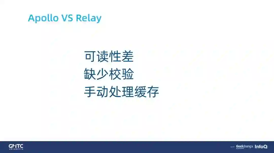首先,不光可读性非常差,而且写代码也非常痛苦;其次,也是最重要的一点,Relay 在前端完全没有利用到 GraphQL Client 的类型校验能力。如果传的参数错了,就没有这个字段,一定要到请求完后端之后,才能感知到这代码写错了;如果有 GraphQL Client 方案的话,在构建编译时就会直接报错,不用等到请求后台接口这一步。最后,在前端可能需要自己手动处理后台接口的缓存。
