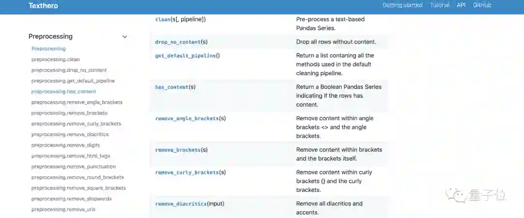 当然,如果你需要对文本信息进行更细节的处理操作,例如将所有标点符号替换成空格、或者删除<>中的所有内容,Texthero也提供了非常完备的工具包,以供使用。