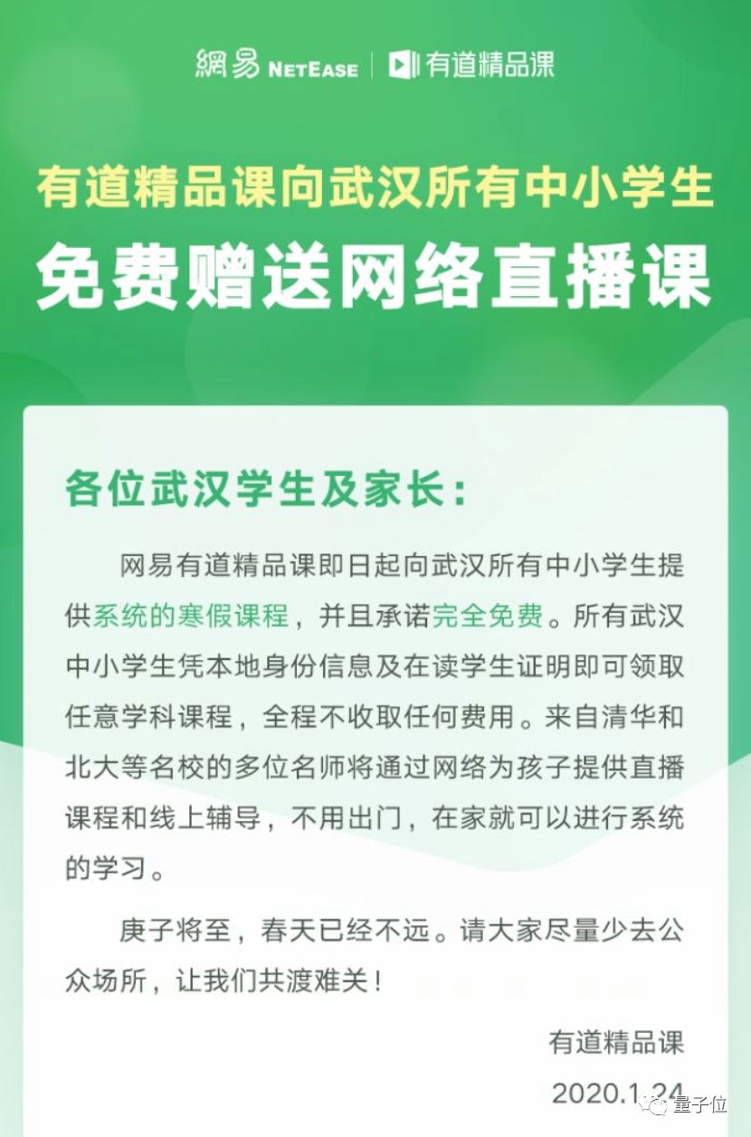 除了网易严选有专供湖北的一分钱口罩之外,网易有道为武汉中小学生免费提供寒假课程。