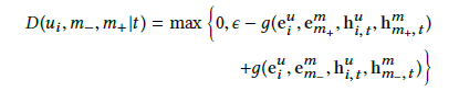 U 是用户集合,u_i 是用户 i,m_+ 是高分视频,m__ 是随机从视频集合中采样出的低分视频,最后我们采用 hinge 损失函数来优化判别器 D,具体公式如下: