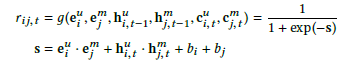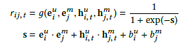 我们采用 attention 机制动态调整 MF 和 RNN 的融合方式,如图 Figure2(d),公式如下: