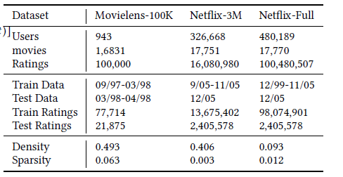 数据集:为了验证我们模型的有效性,我们在两个广泛使用的数据集进行测试 Movielens100K 和 Netflix,为了评估模型的鲁棒性,我们分别进行了 3 个月 Netflix 和全集 Netflix 的实验,数据集细节如下: