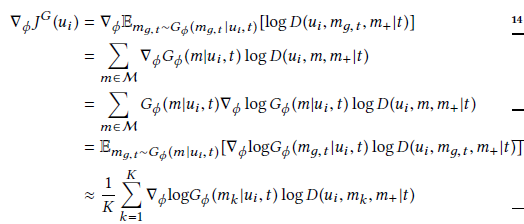 强化学习:由于视频采样的过程是离散的,不能采用标准的 GAN 公式来优化。因此,我们采用 policy gradient 来优化生成器 G,使得 G 能生成高收益的推荐列表来欺骗判别器 D。具体来说,推导如下: