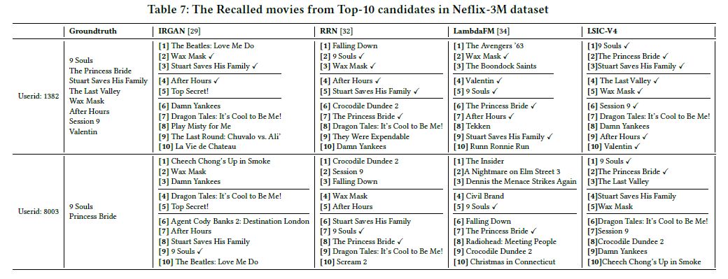 此外,我们还进行了 case study 的分析。我们从 Netflix 数据集中随机选择两个用户并为其生成推荐列表。LSIC 模型可以更有效的进行推荐。例如,用户“8003”的电影“9 Souls”从排名5(LambdaFM)增加到排名 1(LSIC-V4)。