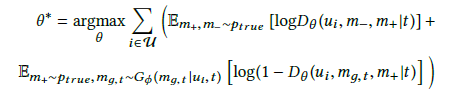 生成器:(Figure1 的左边)类似于条件 GAN,我们的生成器 G 输入用户偏好数据和时刻 t,给用户 i 生成推荐列表,具体公式如下: