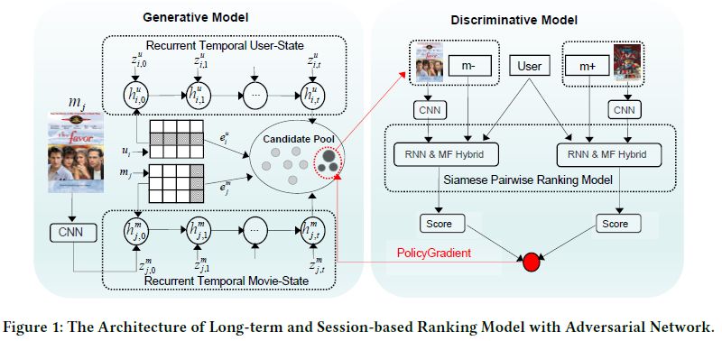 总结:我们提出了一种新颖的基于生成对抗网络的推荐系统,采用强化学习动态调整历史长期偏好和短期会话的模型,此外,我们加入了封面图片特征进一步提升系统性能,最后在两个数据集上做到 state-of-art 的性能。